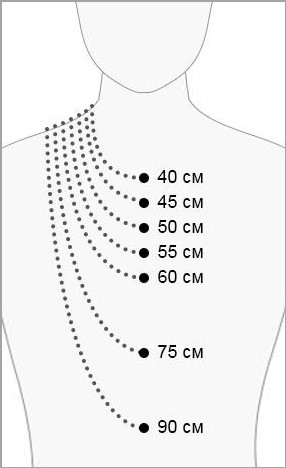 Довжина підвіски вимірюється в сантиметрах з відстанню в 5 см. Для початку необхідно виміряти об'єм твоєї шиї. Для цього візьми сантиметрову стрічку, оберни навколо шиї та зафіксуй на рівні, на якому бажаєш носити кольє. Отриману цифру (в сантиметрах) необхідно округлити до 5 см у більший бік – для комфорту довжина ланцюжка має бути на 2-3 сантиметри довшою за окружність твоєї шиї. Для зручності на кожному підвісі ми передбачили кільця для регулювання, що дозволяють змінювати довжину на кілька сантиметрів.